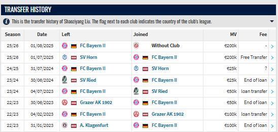 此前德转显示,刘邵子洋自由身离开奥地利乙级球队SV霍恩,“加盟”拜仁二队。